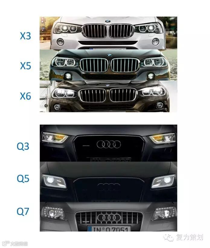 但是,当我们看看宝马车的前脸的时分,会惊奇地发现,人家是把辅助图形的“分歧性”真的做到极致了。无论是“双肾型进气格栅”,还是“四个圈日间行车 灯”,在一切的车型上都做到十分分歧(下图是宝马X3、X5、X6三款越野车的前脸)。但是,相比之下,奥迪就不行了,我们就拿奥迪同样是三款越野车 Q3、Q5、Q7的前脸来比照,三款车的前大灯,分别是三种不同的作风(如下图),无论外形,还是颜色,都步调一致,与宝马相比,差距还是很大。
