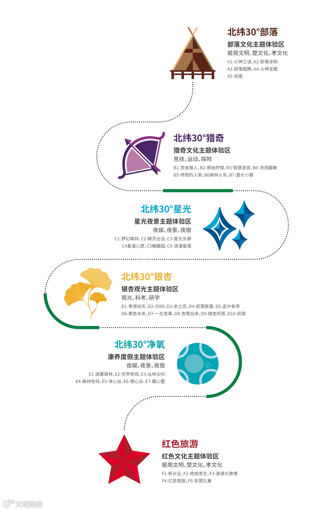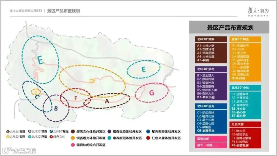 依托古银杏群落和新五师革命旧址,按照国家5A级景区标准,坚持在保护的基础上高标准、高品位进行开发,通过对文化IP的延伸,充分发挥景区资源价值,打造了北纬30°部落、北纬30°猎奇、北纬30°星光、北纬30°银杏、北纬30°净氧、红色旅游六大产品IP,形成新奇古森林的产品壁垒,为消费者打造沉浸式的游玩体验。丰富的产品设计既提升了消费者体验,也增加了游玩的深度、时长,为景区增加经济创收,铸就森林旅游的第一品牌。