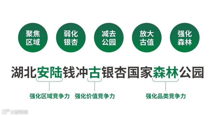 项目组通过多维度的分析研究后,大胆而严谨地提出了创新性的品类竞争策略——打造森林品类里最具特色的差异化森林景区。项目组在对景区进行深入分析时,发现“湖北安陆钱冲古银杏国家森林公园”景区名称有四大不利基因、三大有利基因。