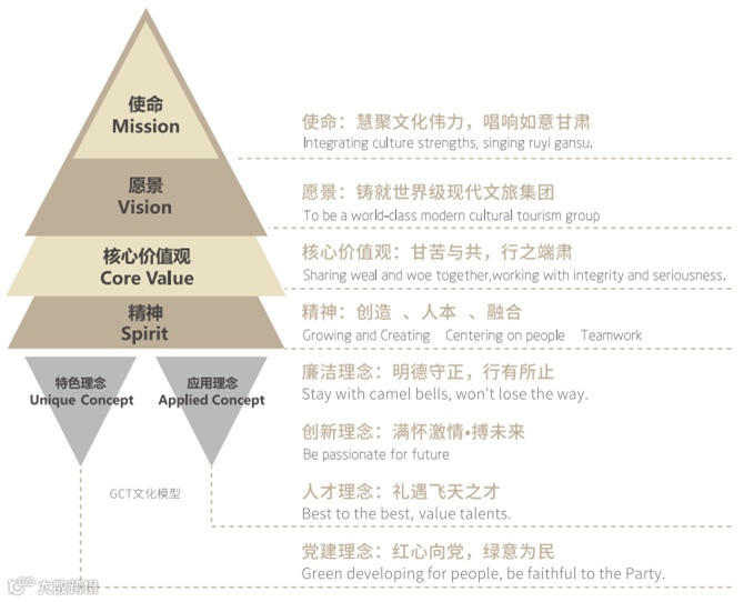 项目组通过对甘肃文旅集团各子公司的文化梳理,在多元文化基因之上搭建集团企业文化体系,明确集团使命、战略愿景、企业精神等核心理念,建立起团队共识机制和目标,形成统一的企业文化认同,最大限度地优化企业人文素质,凝聚职工力量,形成集体战斗力,提高集团的市场竞争力。
