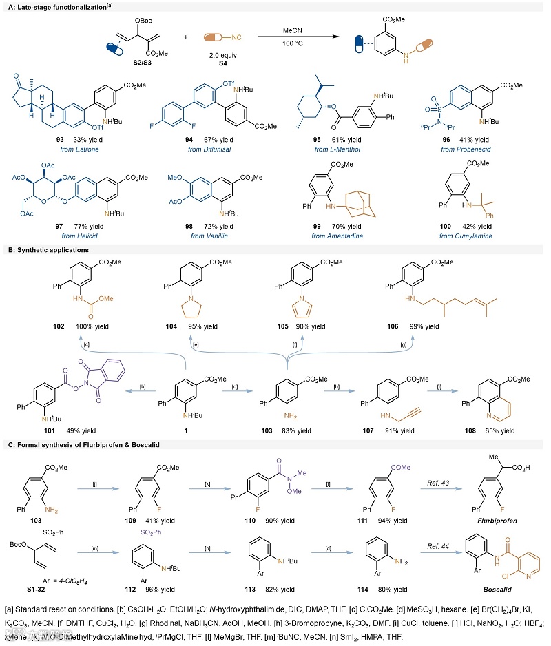 由于MBH碳酸酯和异腈分别来自于广泛易得的醛类和胺类化合物,作者从生物活性分子或药物分子出发合成了相应的底物,将芳胺化反应应用于这些化合物的后期修饰(图5A)。作者通过以苯胺