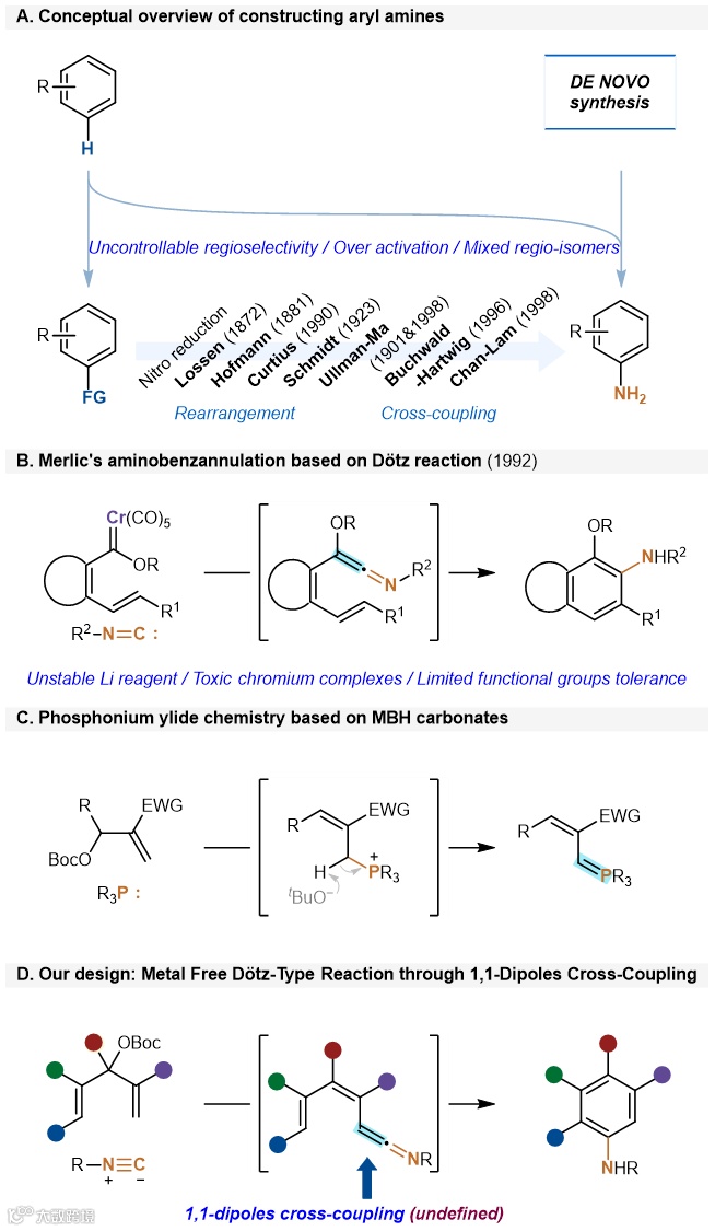 芳胺在天然产物、药物和有机材料中广泛存在,在有机合成中一直备受关注。预官能化或C-H胺化的过程中由于芳香类化合物固有的反应特性,经常会导致不可控的位点选择性、过度活化以及生成不可分离的区域选择性异构体混合物。而从头合成的策略可以通过设计合理的底物来规避芳香化学的选择性问题(图1A)。1992年,Merlic基于Dötz反应巧妙地利用异腈化合物和Fisher铬卡宾构建了烯酮亚胺中间体,并实现了芳胺化反应(图1B)。但反应中使用的化学计量不稳定的有机锂试剂和有毒的铬卡宾限制了其进一步发展,因此仍然迫切需要更简洁、更安全的芳胺合成策略。