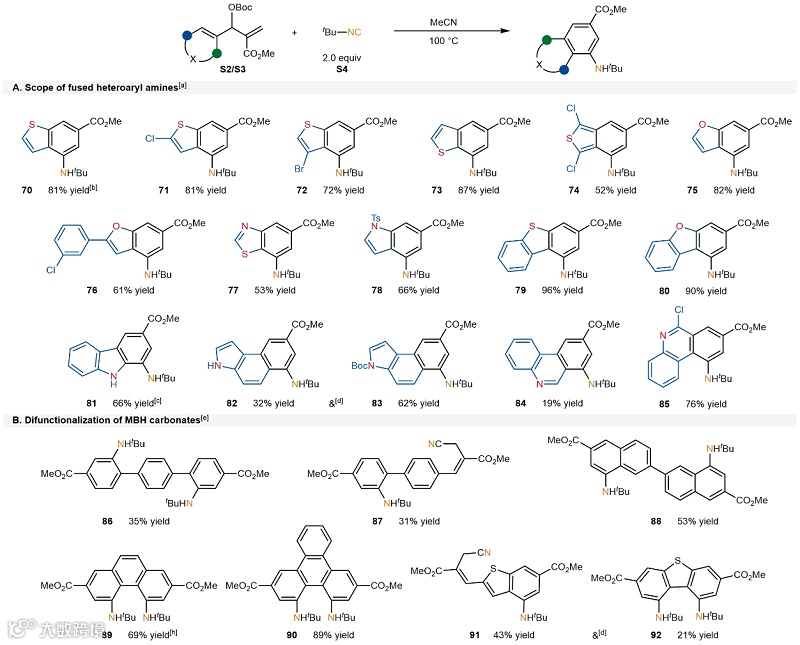 而当使用杂芳基MBH碳酸酯参与反应时,可以对应的合成杂稠环芳胺类化合物,包括氮杂环、氧杂环、硫杂环(图4A)。当使用双MBH碳酸酯取代的底物时,该团队合成出了双官能的产物,得到了众多新颖的稠环芳胺骨架(图4B)。其中很多是未报道过的芳胺类化合物。
