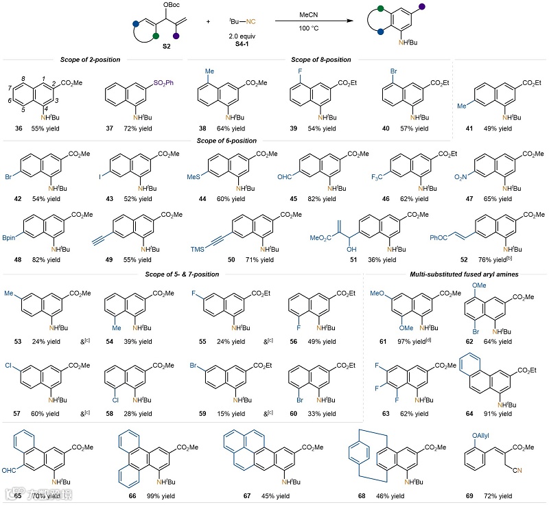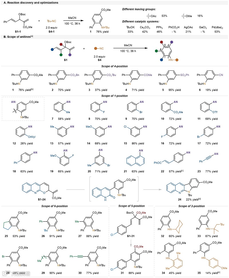 作者在确定了最佳反应条件之后,首先对于烯基MBH碳酸酯以及异腈化合物的适用范围进行了考察。结果表明,通过合理的底物设计,可以轻松实现目标产物苯胺五个位点的取代基变化,以较好的收率得到一系列官能化的苯胺类化合物(图2)。