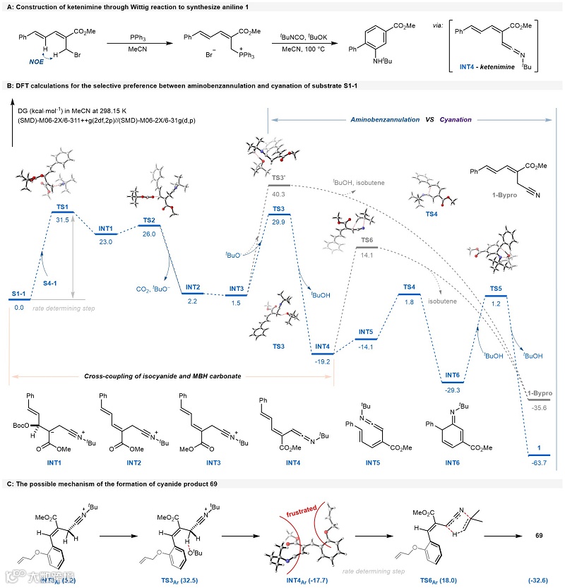 为了进一步理解反应机理,作者首先设计了膦叶立德和异氰酸酯的Wittig反应,分离得到了相应的苯胺,进一步确认了反应经历了烯酮亚胺中间体(图6A)。通过DFT计算,作者证实反应中芳胺化的过程相比于氰基化的过程在动力学和热力学上都更有利,揭示了化学选择性得起源(图6B)。另外,生成化合物