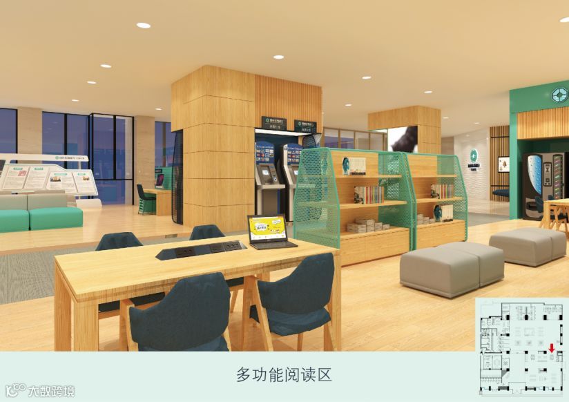 在营业部的入口一侧,设计了一个特色区域,集自助业务办理、洽谈、阅读等功能于一体。