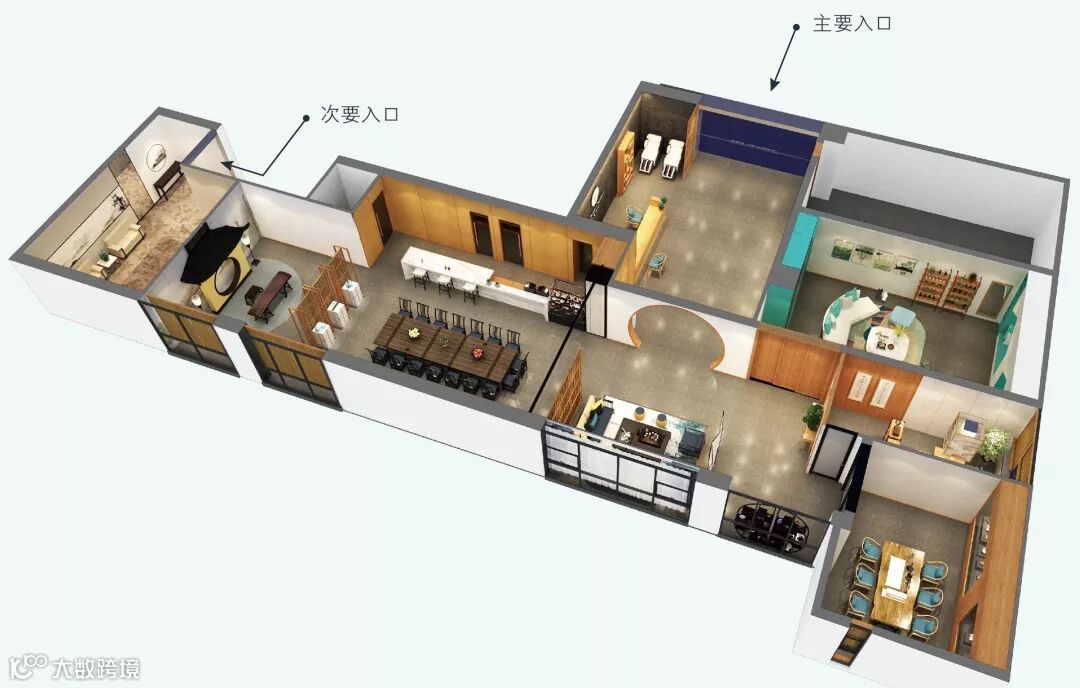 特别是其中的大型会务空间,由于体量较大,将其设计为开放式空间。当需要进行会务时,利用预留在天花板中的轨道,将移动墙体闭合,该区域将变为一个独立的空间。