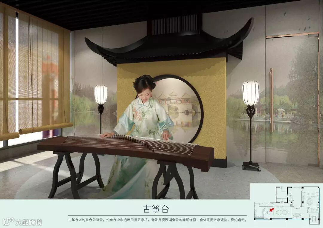 在大型会务空间的一侧,以瘦西湖“钓鱼台“为背景,设计了一个古筝台,为该会务空间增添些许老扬州的韵味。