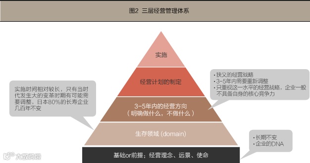 第二层是企业赖以生存的领域 (domain),大变革时期也许有改变的需要,但大多数长寿企业都是坚持几百年主营不变。当然也有像丰田那样有着“一代一业”理念的公司。生存领域要不要转变,与经营理念密切相关。在好的企业,至少它要被深耕上几十年甚至上百年。