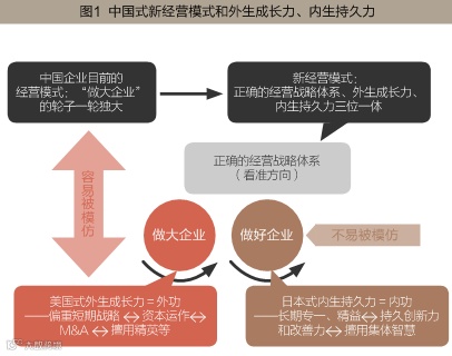 对于后发赶超型的企业来说,需要的是既能快速增长,又可持续发展的新经营模式,可将之概括为: “经营战略×做大企业×做好企业”(图1)。其中,最重要的是要有完善的经营战略体系,看准方向。方向错了,企业跑得越快,越危险。同时,企业朝着既定方向前行,至少需要两个轮子的支撑,一是“做大企业”,一是“做好企业”。本文将前者称为“外生成长力”,简曰“外功”,后者称为“内生持久力”,简曰“内功”。