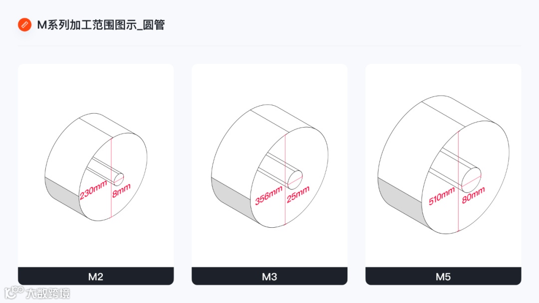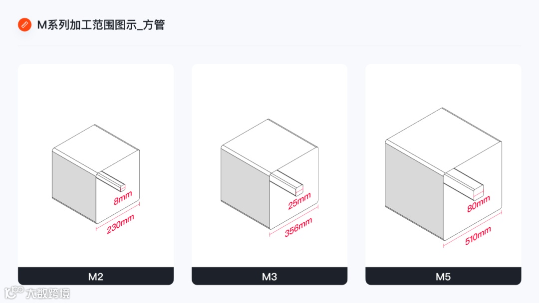 M系列采用方圆结构卡盘,加工范围(方管边长/圆管直径)为8mm-510mm,支持超长管材(15000mm)加工。