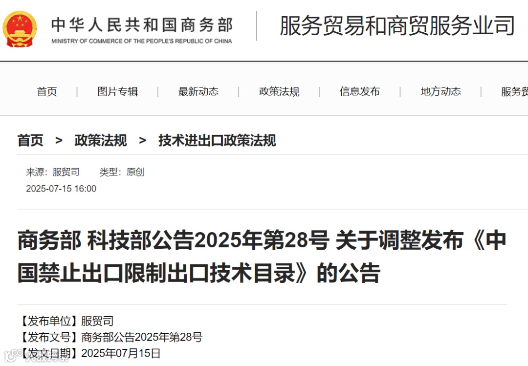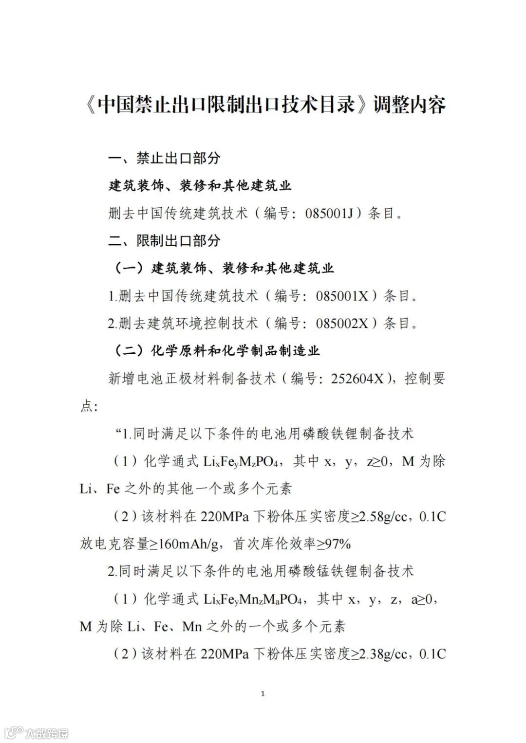 根据《中华人民共和国对外贸易法》和《中华人民共和国技术进出口管理条例》,商务部、科技部对《中国禁止出口限制出口技术目录》(商务部 科技部公告2023年第57号附件)内容作部分调整,现予以公布,自公布之日起实施。属于军民两用技术的,纳入出口管制管理。