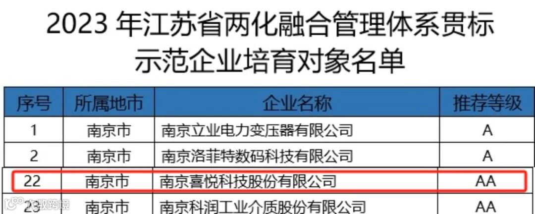 目前,江苏省工信厅组织公示了2023年度江苏省两化融合管理体系贯标示范企业培育对象名单,我司已投企业南京喜悦科技股份有限公司入选为AA级培育对象。