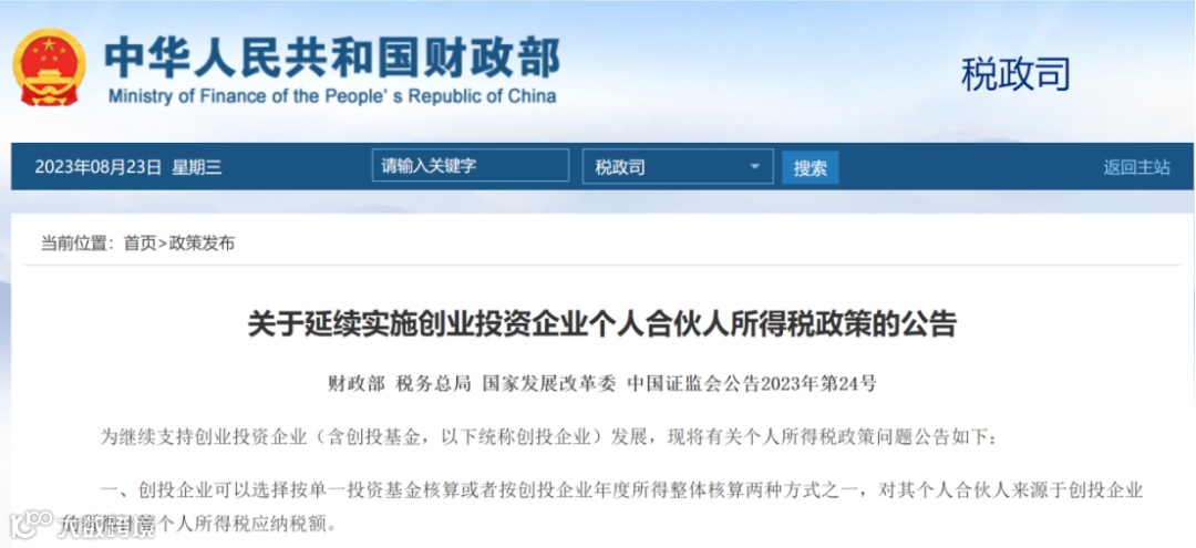 8月22日晚间,财政部、税务总局、国家发展改革委、中国证监会四部门联合发布《关于延续实施创业投资企业个人合伙人所得税政策的公告》。
