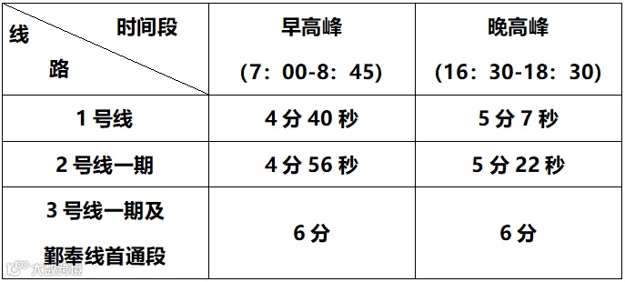 工作日平峰期1号线及2号线一期行车间隔为7分58秒,3号线一期及鄞奉线首通段行车间隔为8分;