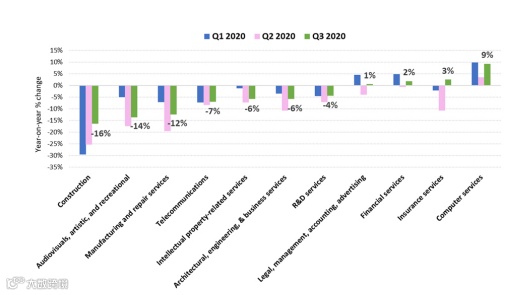 世贸组织1月26日发布的全球服务贸易统计数据显示,建筑、娱乐、法律和金融服务等“其他服务业”的贸易表现反复出现不平衡: 大多数分部门都出现了收缩,计算机服务业是一个明显的例外。由于疫情爆发,许多国家的建筑项目被推迟或推迟,全球建筑出口同比下降16% ,一些亚洲出口国出现了大幅下降。视听、艺术和娱乐服务业也出现了两位数的下降(- 14%) ,美国的出口下降了24% ,英国的出口下降了近一半(- 45%)。法律、管理、会计和广告服务业同比增长不温不火,反弹幅度为1% 。全球金融服务业增长了2% ,不同地区的出口商出现了正增长。其中包括欧盟,其金融服务出口同比增长4% 。由于全球对云计算、平台和虚拟工作场所的需求不断增长,计算机服务在第三季度仍然是最具活力的行业,增长了9% 。