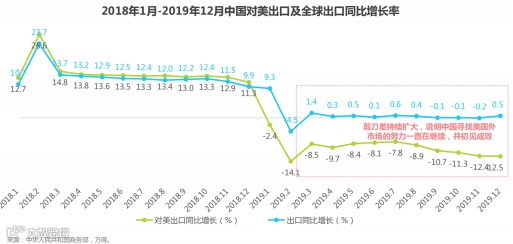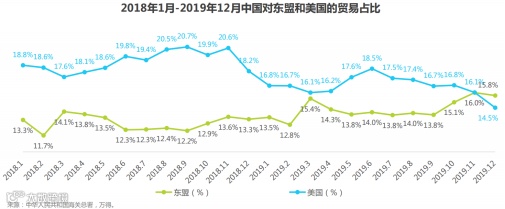 在两年间,中国对美贸易总额占比整体处于下降趋势,而对东盟贸易却呈现上升趋势。这一方面说明,基础工业制造向生产成本更低的国家转移,中国不知不觉间也成为了基础商品的需求方;另一方面也为中国维持固有庞大的国家轻重工业找到了新的平衡点。