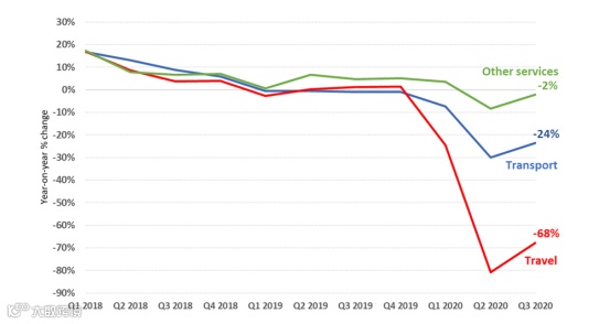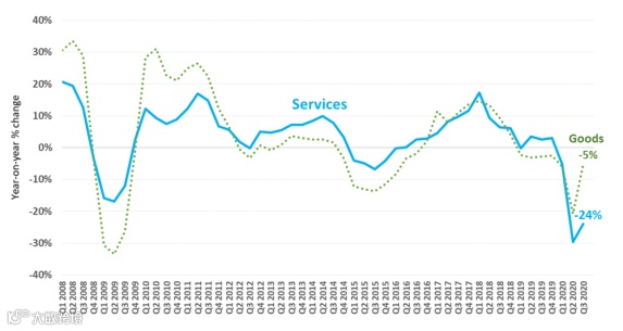 世贸组织1月26日发布的全球服务贸易统计数据显示,2020年第二季度,全球服务贸易额同比下滑30%,创2008年至2009年国际金融危机以来最大跌幅;2020年第三季度全球服务贸易同比下降仍然达到24%,2020年11月,全球服务贸易仍比2019年同期水平低16%。