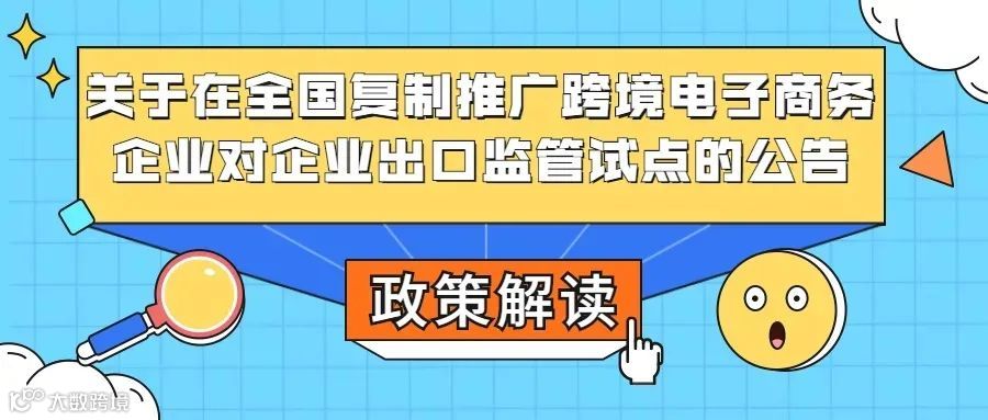 2021年6月22日,海关总署发布《关于在全国海关复制推广跨境电子商务企业对企业出口监管试点的公告》(海关总署公告2021年第47号),自7月1日起,在全国海关复制推广跨境电商企业对企业(跨境电商B2B)出口监管试点。这标志着自海关总署公告2020年第75号公布的10个试点海关、海关总署公告2020年第92号增加12个试点海关后,跨境电商企业对企业出口监管试点正式向全国海关复制推广。