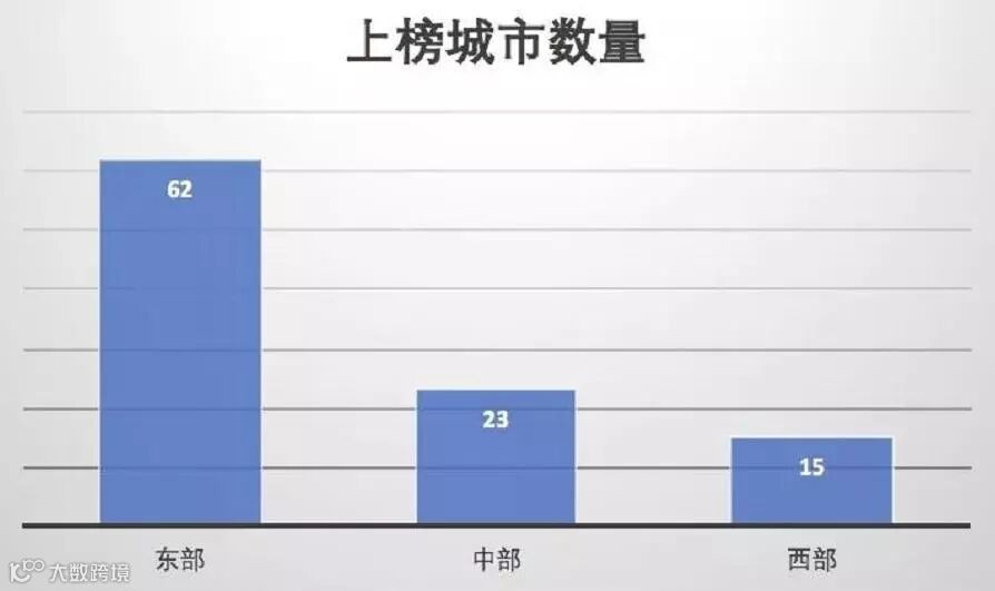 三大经济圈中百强城市高度集聚。长三角地区上榜城市23个,珠三角地区8个,京津冀地区8个,三者合计上榜39个。尤为引人注目的是,长三角有上海、杭州、苏州和南京四座城市跻身前十阵营。