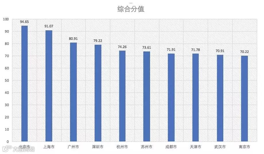 从前十强的得分来看,北京(94.65分)和上海(91.07分)综合得分达90分以上,显然是强一线城市。北京和上海经济水平相差不大,但北京作为首都,资源优势明显,软经济实力强劲,尤其是在环境、科教和卫生方面均显著高于上海。