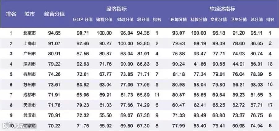 从南北格局看,前十城市中,南方占据8座,北方只有京津两市。