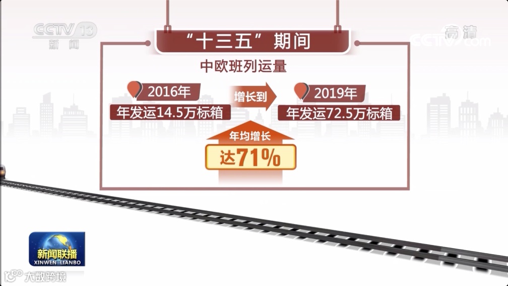 “十三五”期间,中欧班列运量由2016年的年发运14.5万标箱增长到2019年的72.5万标箱,年均增长达71%。发送的货物小到巧克力大到汽车,货物种类不断丰富。目前,中欧班列已经通达欧洲21个国家、92个城市。预计今年底,中欧班列年运量将超过100万标准箱。中欧班列已发展成为“一带一路”建设的标志性品牌。
