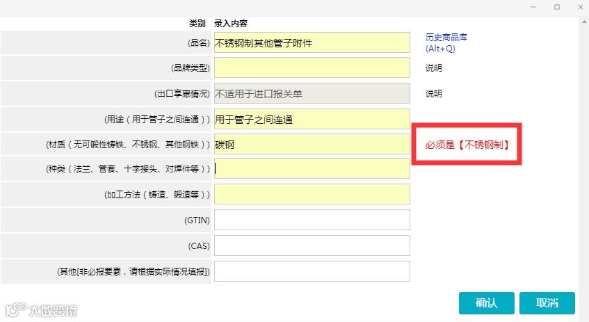 如塑料材质的货物应填写为“聚乙烯”、“PET”等,钢铁类应填写为“不锈钢”、“硅锰钢”等。