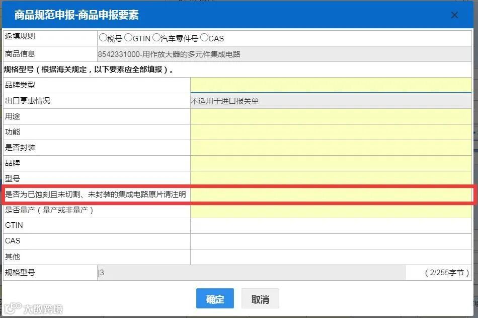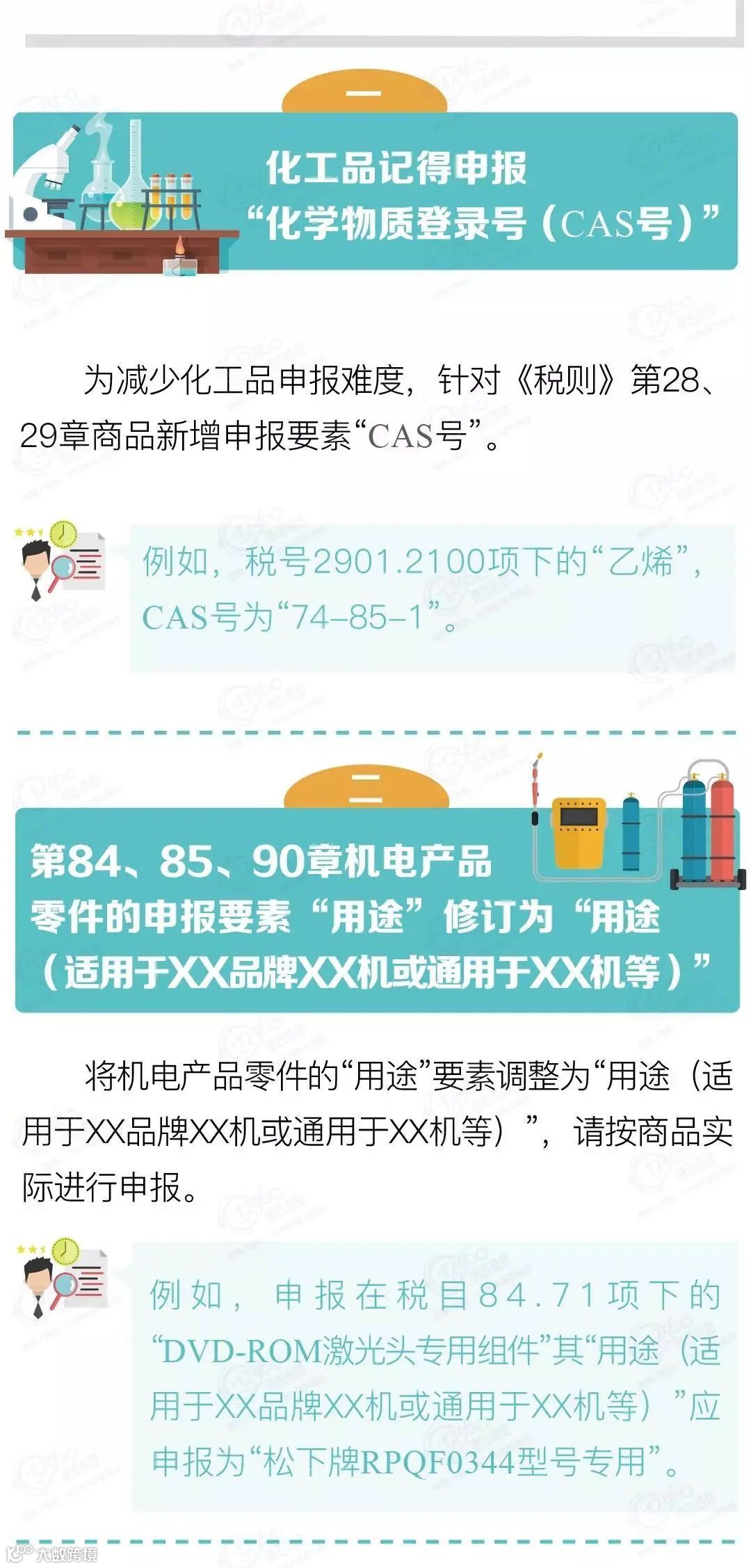 包装规格:除填写商品的重量或数量包装要求外,还需填写“非零售包装”或“零售包装”,涉及33章、34章、38章等章节;