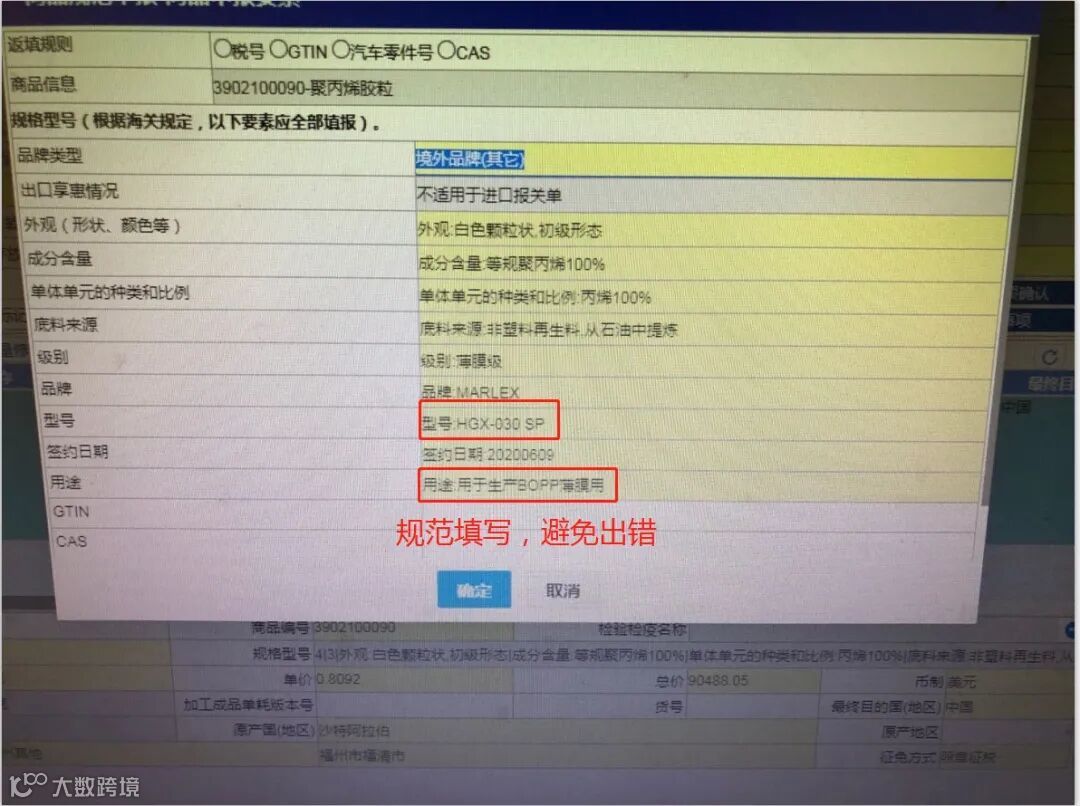 规格:主要表示货品大小尺寸,应申报完整,如块状、板状物申报“长宽厚”,卷状申报“宽幅、单层厚度、长度”,管状物申报“外径内径长度”等,原则上不能申报为“无规格”,不规则品应填报为“不规则形状”;