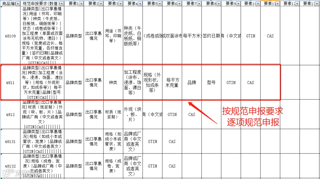 如品目48.11的申报要素“规格(成条等、浸渍或涂布物、每平方米克重)”,应按实际逐项具体申报为“成条、浸渍甘油、300克/平方米”;