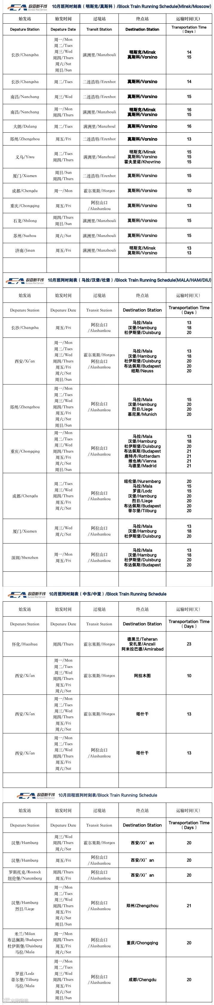 从愉快的第15届中国(深圳)物博会满载而归,湖南欧亚新干线又投入了十月份班列计划的安排中,现将我司2020年10月份班列运行时刻表提供给各位尊贵的客户,以供选择。欢迎致电询价,订舱下单。