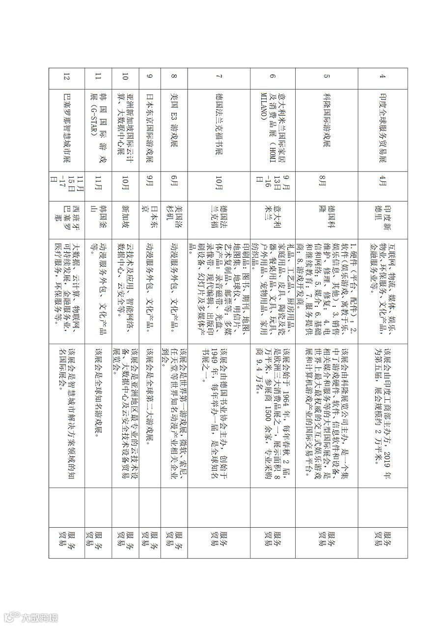 其中服务贸易类展会项目共12个,其中 A类主办类展会项目 3个,B类重点组织类展会4个,C类重点推荐类展会5个。