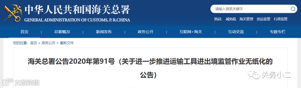 为贯彻落实“放管服”改革要求,优化口岸营商环境、促进物流便利化,海关总署决定进一步推进运输工具进出境监管领域作业无纸化,进出境运输工具负责人、进出境运输工具服务企业可向海关提交电子数据办理相关手续。现将有关事项公告如下: