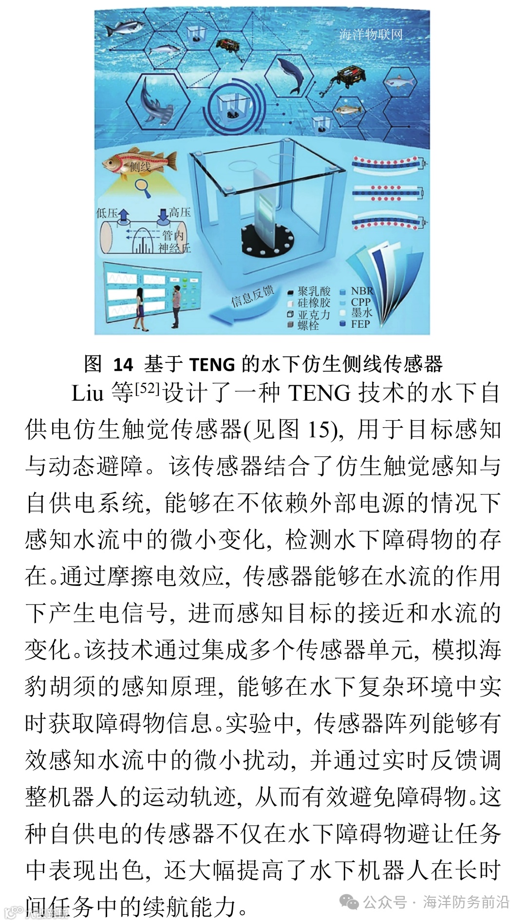 近年来, 随着材料科学、微电子学和人工智能等技术的快速发展, 水下仿生感知技术的研究与应用取得了显著进展。尤其是摩擦纳米发电机(triboelectric nanogenerator, TENG)技术、柔性传感器阵列和深度学习算法等的引入, 极大地推动了水下仿生传感器的灵敏度、稳定性和智能化水平的提升。如今, 水下仿生感知技术不仅在科研领域取得了突破性进展, 也逐渐应用于以水下机器人、智能渔网、海洋资源勘探和环境保护等为代表的商业和工业领域。