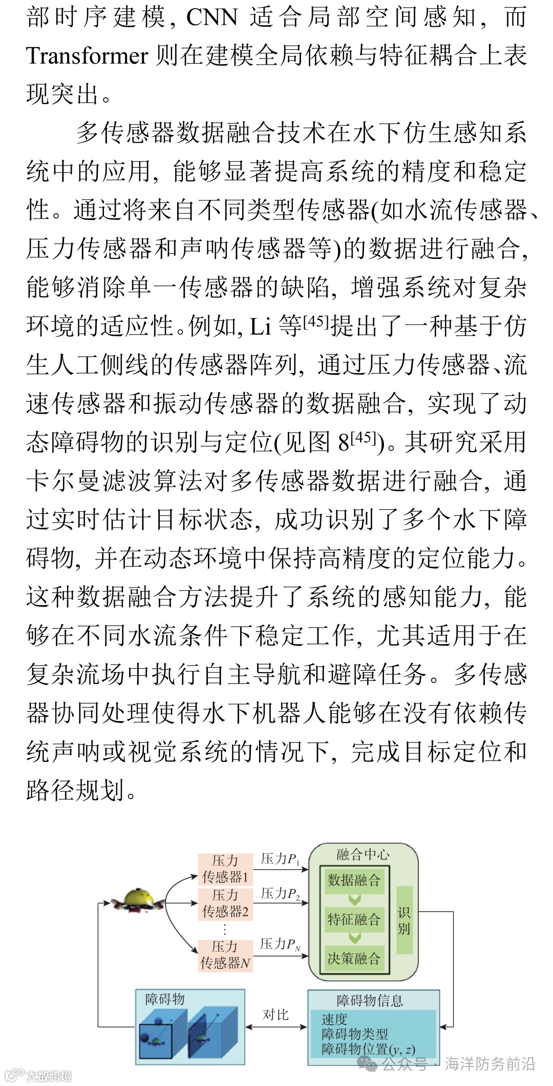 目前水下感知技术大多依赖单一传感器, 但在复杂环境中单一传感器的局限性逐渐显现。未来研究应重点关注多模态感知系统的设计与传感器数据融合技术, 通过将光学、声学、触觉和磁场等多种感知方式结合, 提升水下设备对环境的适应性和应对复杂情况的能力。