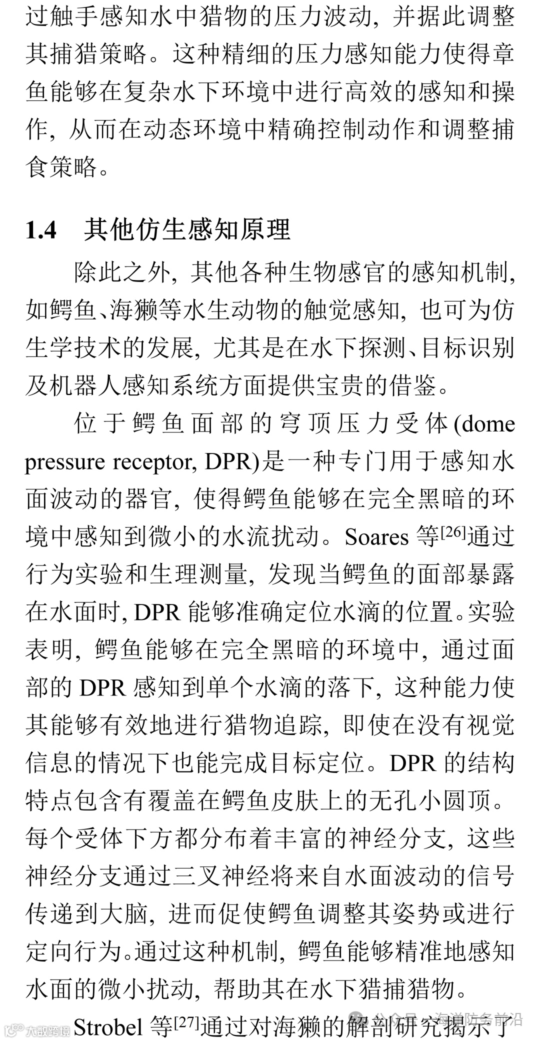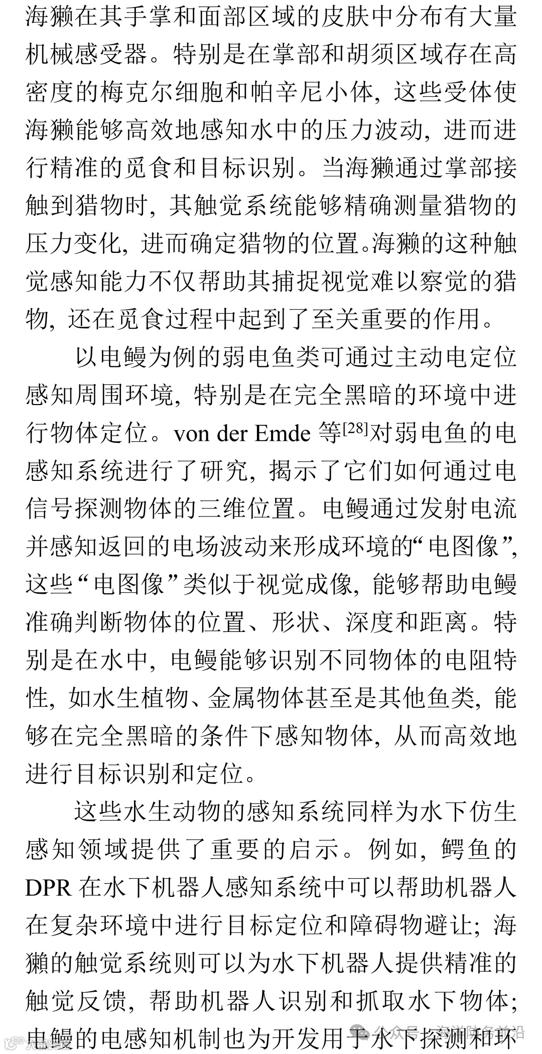 随着全球海洋探索和环境监测需求的不断增长, 水下技术的进步已成为推动海洋科学和技术发展的关键因素之一。水下环境的特殊性, 如光线不足, 温度、压力变化以及复杂流动等特征, 给水下目标的探测、导航和任务执行带来了巨大的挑战。传统的水下感知技术(如声呐和视觉系统), 虽然在某些场合中有效, 但在复杂、动态的水下环境中仍然面临诸多局限。为此, 仿生感知技术作为一种创新的解决方案, 逐渐在水下设备中得到了广泛应用。