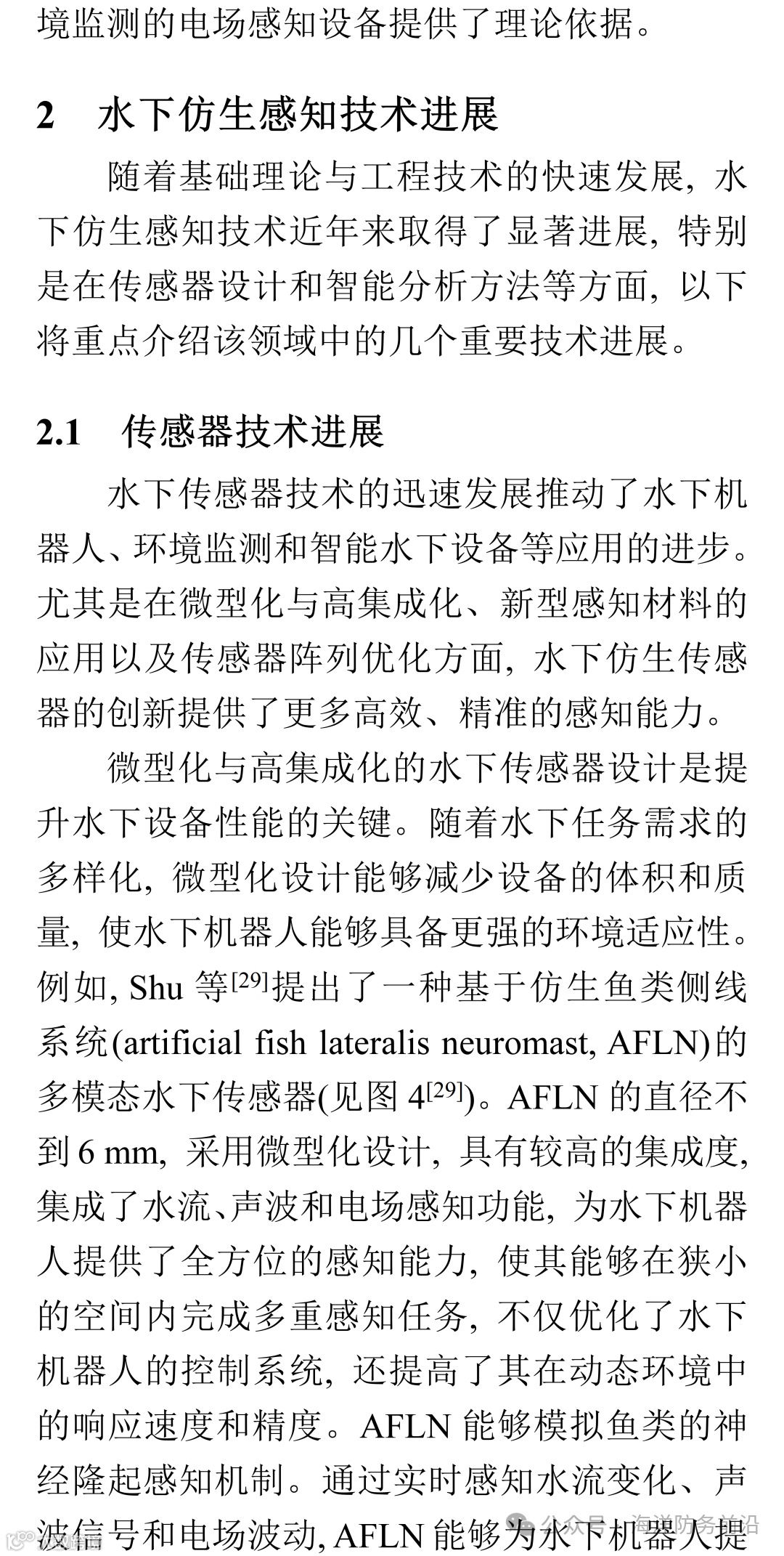 水下仿生感知技术的核心在于传感器的性能。未来的研究应集中在提高传感器的灵敏度、稳定性和抗干扰能力, 尤其是在高压、低温、复杂流动和浑浊水域等极端环境下。此外, 传感器的微型化和集成化将是未来发展的趋势之一, 如何将多种感知功能集成到单一传感器中, 将极大提升水下设备的功能性和操作便捷性。