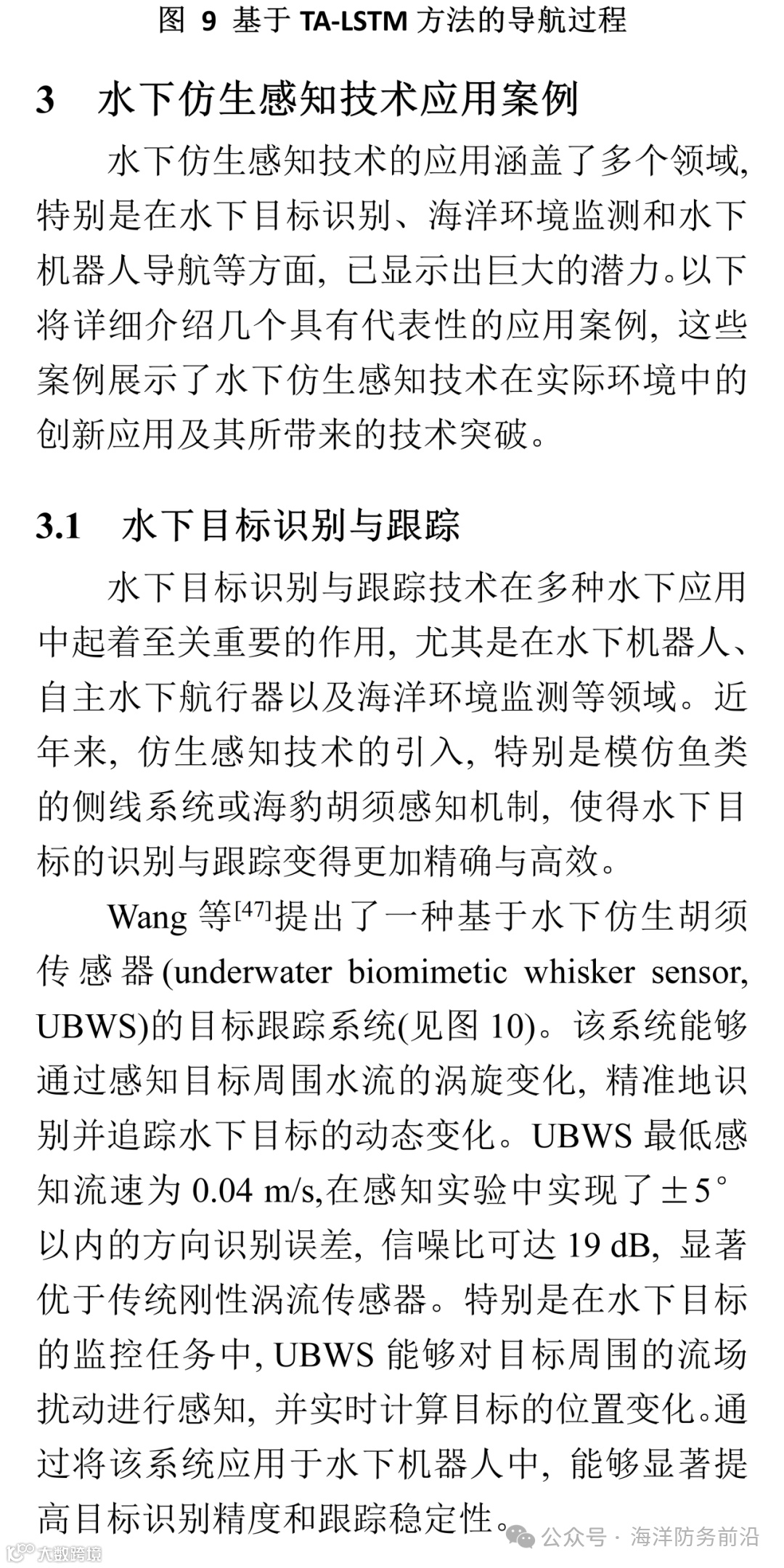 尽管水下仿生感知技术在实验室环境中取得了诸多突破, 但如何将这些技术成功应用于实际水下任务仍面临挑战。未来研究应注重技术的实际应用转化, 特别是在水下机器人自主导航、深海探测以及海洋资源开发等领域; 同时还应考虑提升水下仿生感知技术在复杂环境中的适应性, 确保其在实际操作中的稳定性和可靠性。