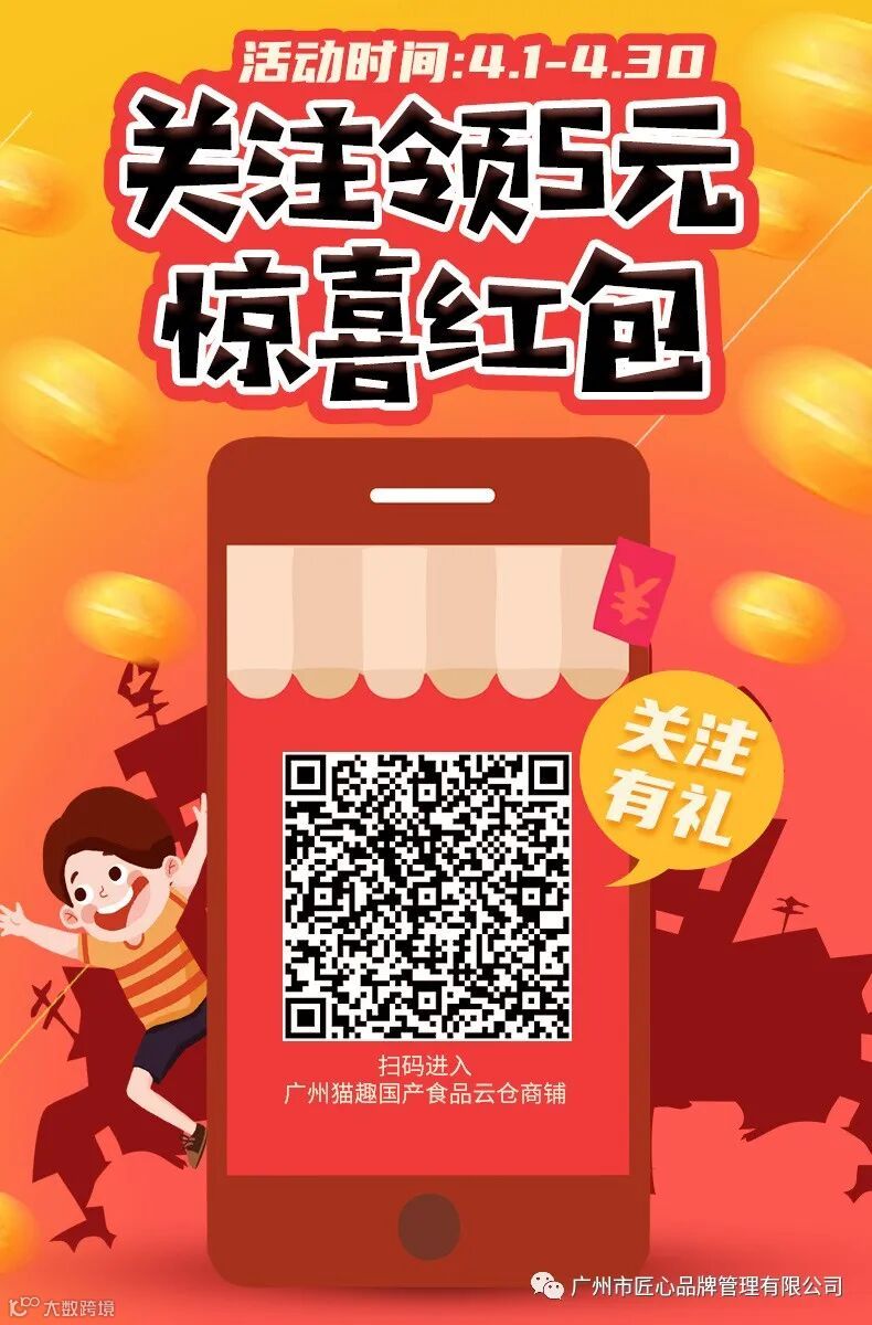 识别下面海报中的二维码进入猫趣店铺关注店铺即可领取5元红包