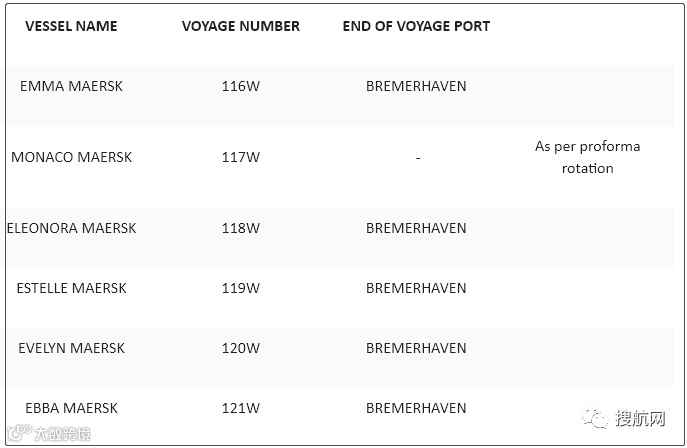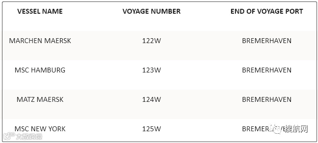 马士基表示,“由于堆场高密度,我们的船只等待时间特别长”,该公司最初决定取消在汉堡Eurogate码头的停靠,但由于情况没有改善,决定将再持续四周。从汉堡转向不来梅港的船舶清单: