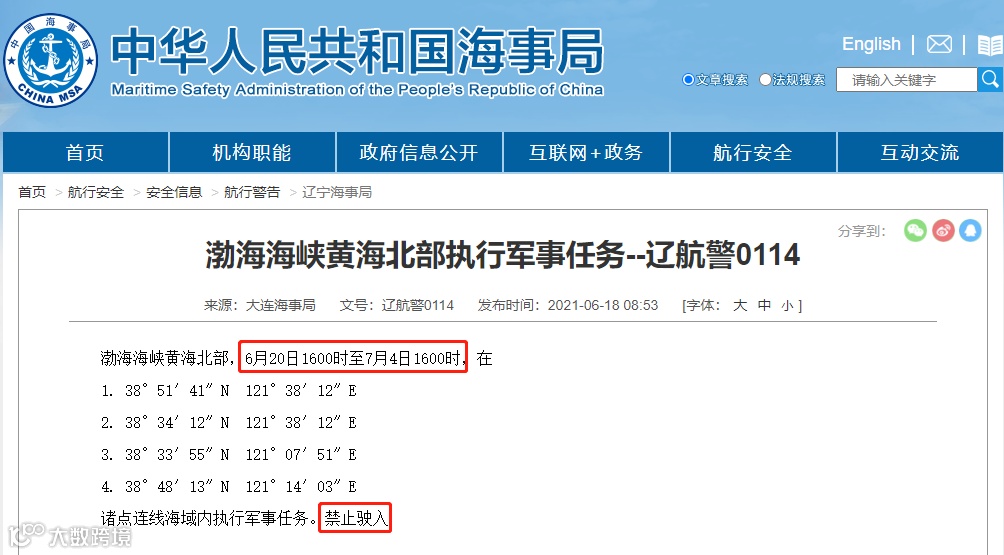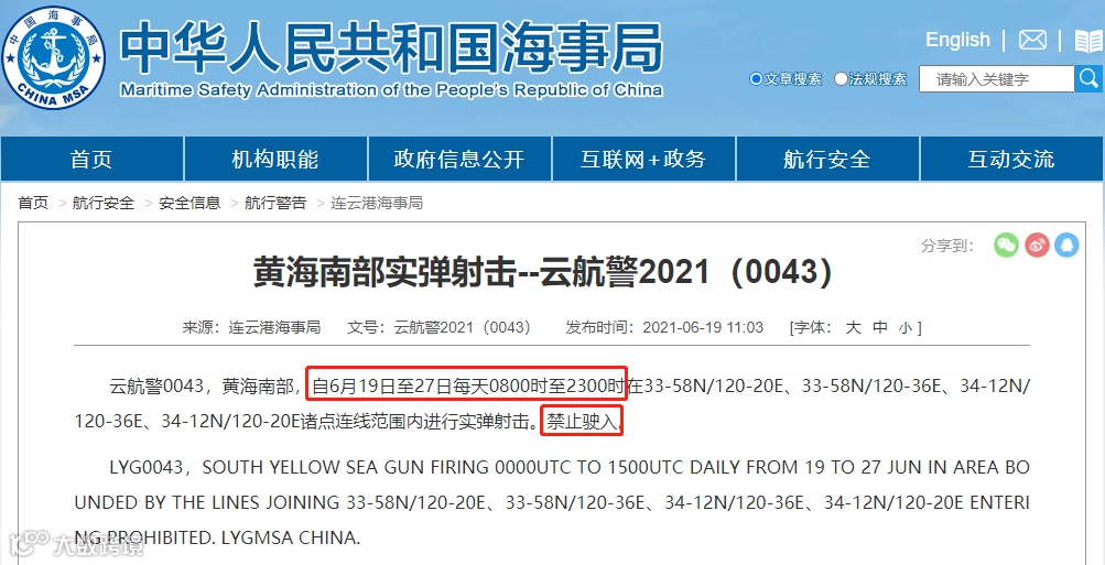 重要禁航通知:根据海事局最新公布的消息,6月22日至7月4日期间,渤海海峡、黄海北部、南海、东海四大海域部分海域因军演演习、实弹射击实施连续多天的禁航。可能会对部分港口船期造成一定影响。