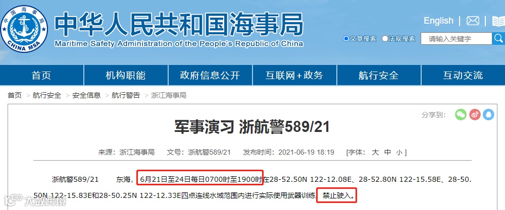 据浙江海事局消息:浙航警589/21,东海,6月21日至24日每日0700时至1900时,在