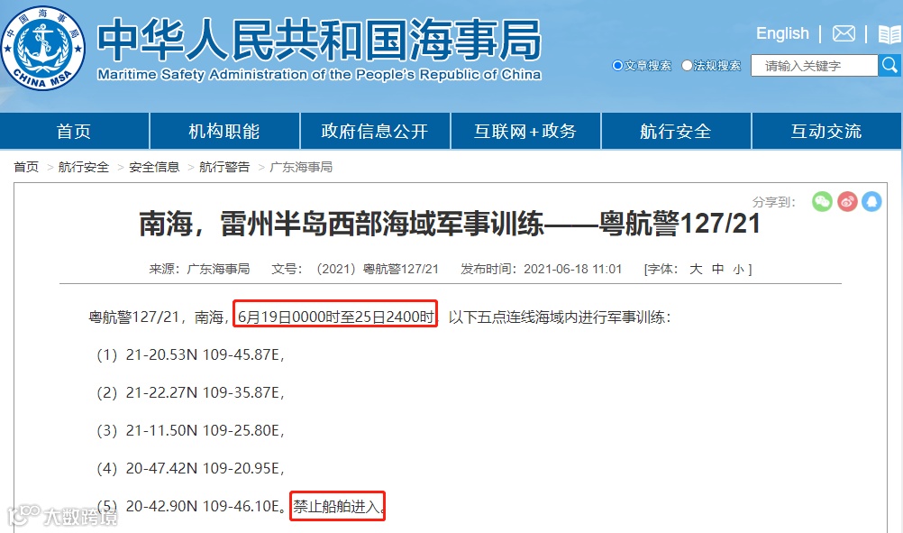 据广东海事局消息,粤航警127/21,南海,6月19日0000时至25日2400时,在