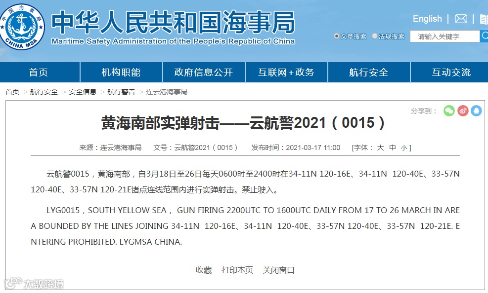 云航警0015,黄海南部,自3月18日至26日每天0600时至2400时在