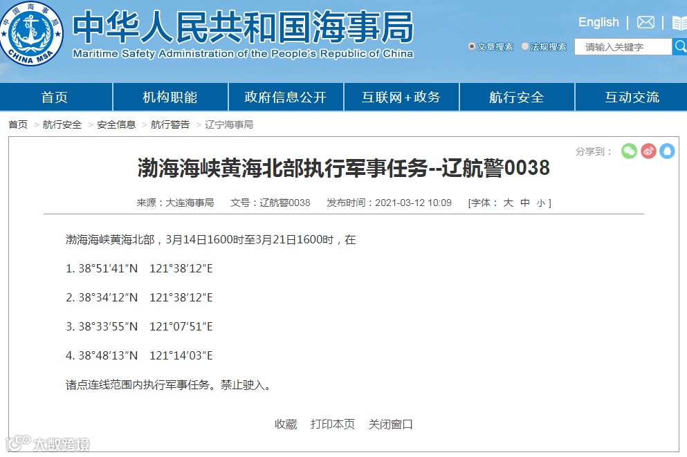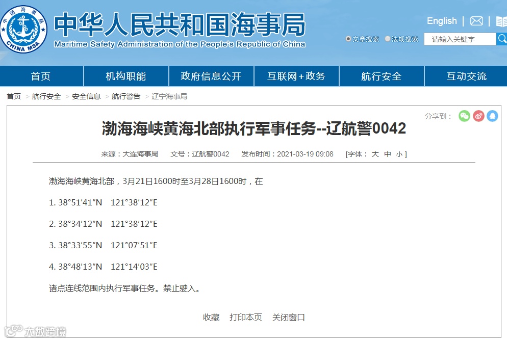 以下海域执行军事任务,可能会造成部分港口船舶晚开晚靠的情况,请货代货主互相理解。