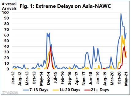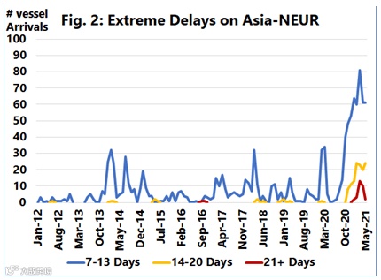 航运咨询公司Sea intelligence指出“港口拥堵远未结束”。仅在2021年5月,在北美港口停靠跨太平洋航线的174艘船延误了7天以上,在亚欧航线,这一数字是114;而在跨大西洋,这一数字是169。同月,在亚洲-印度次大陆的航线中,有99艘船延迟一周以上,而在亚洲-大洋洲,这一数字是134艘。