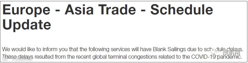 赫伯罗特2021年1月15日发布公告称,近期由于疫情原因导致的全球性港口拥堵,造成船期延误。为此,赫伯罗特亚欧航线部分航次将停航,并通过替代方案解决。