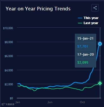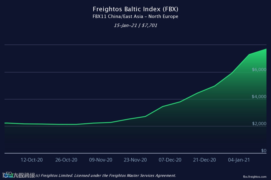 根据波罗的海每日运价指数(FBX)显示,1月15日,从中国到北欧的即期运价达到了令人难以置信的7701美元/TEU ,同比增长268%。