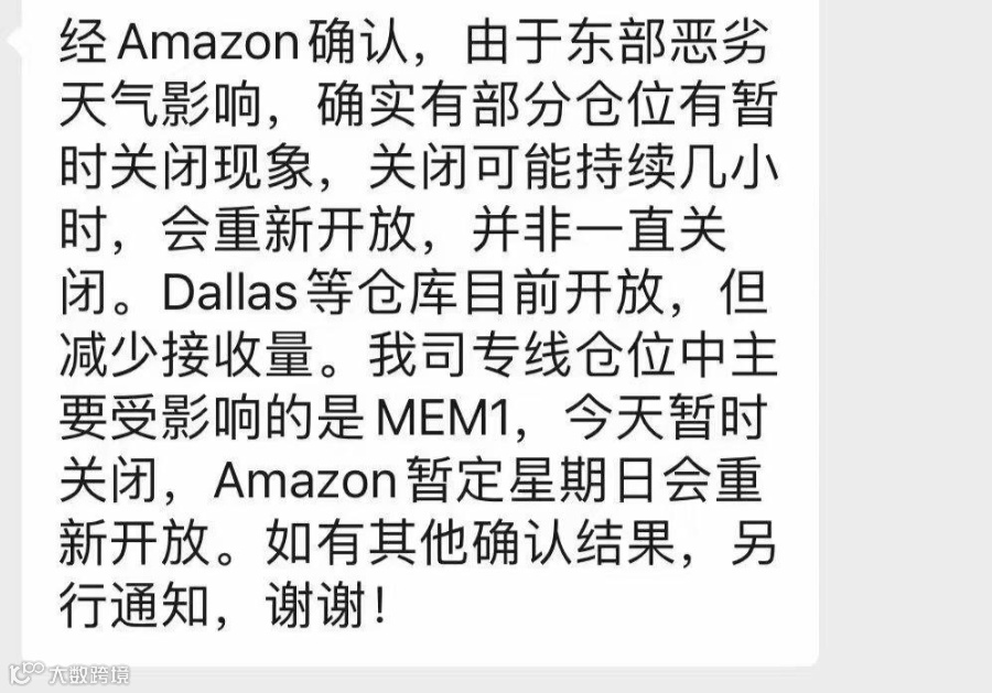 有物流人表示:“经亚马逊确认,由于东部恶劣天气影响,确实有部分仓库出现暂时关闭现象,关闭可能持续几个小时,会重新开放,并非一直关闭。Dallas等仓库目前开放,但减少接收量,而他们公司主要受影响的是MEM1,星期六暂时关闭,但亚马逊暂定星期日重新开放。”